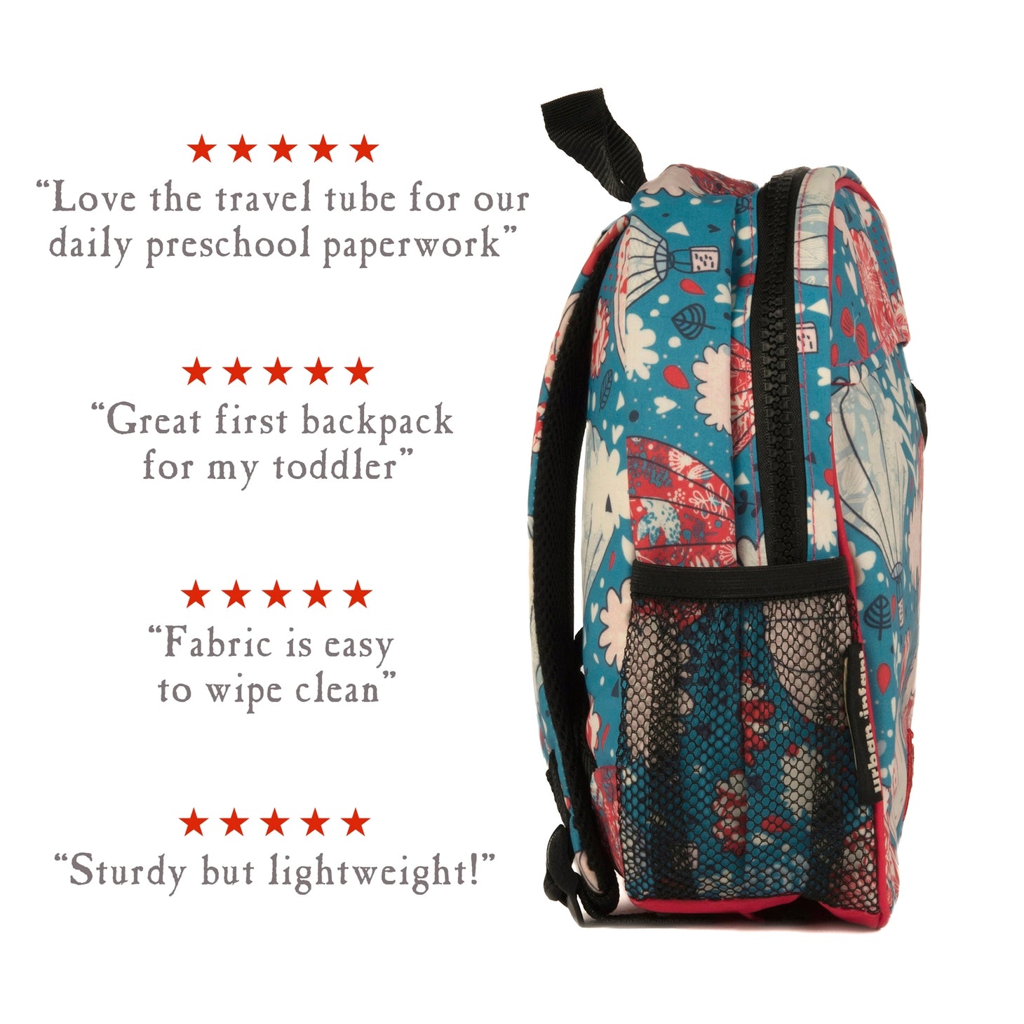 This packie® backpack is lightweight and sturdy – ready for all toddlers to tackle a day at preschool, daycare or a family trip! Constructed with a waterproof outer laminated material, kids love the fun patterns and parents love the ease of care. Features a side water bottle pocket, a d ring, and a patented art silo for rolling up your child's artwork! The size is suitable for children ages 2 – 6.