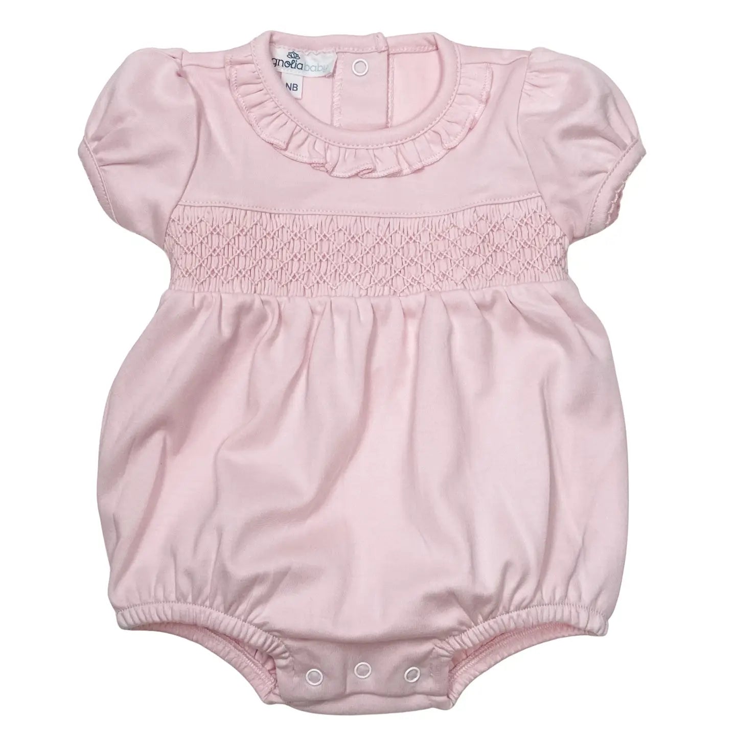 Embrace timeless elegance with this Magnolia Baby Essentials Hand-Smocked Bubble in pastel pink. Crafted from the finest 100% Pima cotton in Peru, this bubble features delicate hand smocking and a ruffled neckline, offering exceptional comfort and classic style for your little one. Perfect for everyday wear or special occasions.