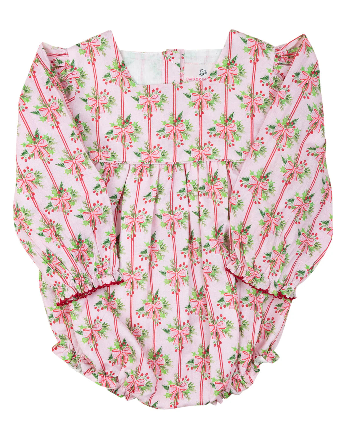 Dress your little one in festive charm with our Holiday Bow Striped Bubble! Featuring a beautiful Christmas wreath print, this adorable one-piece is designed for both style and comfort. Long sleeves and ruffle leg openings add a sweet vintage touch, while the easy snap closures ensure fuss-free changes. A perfect holiday outfit for making treasured memories!