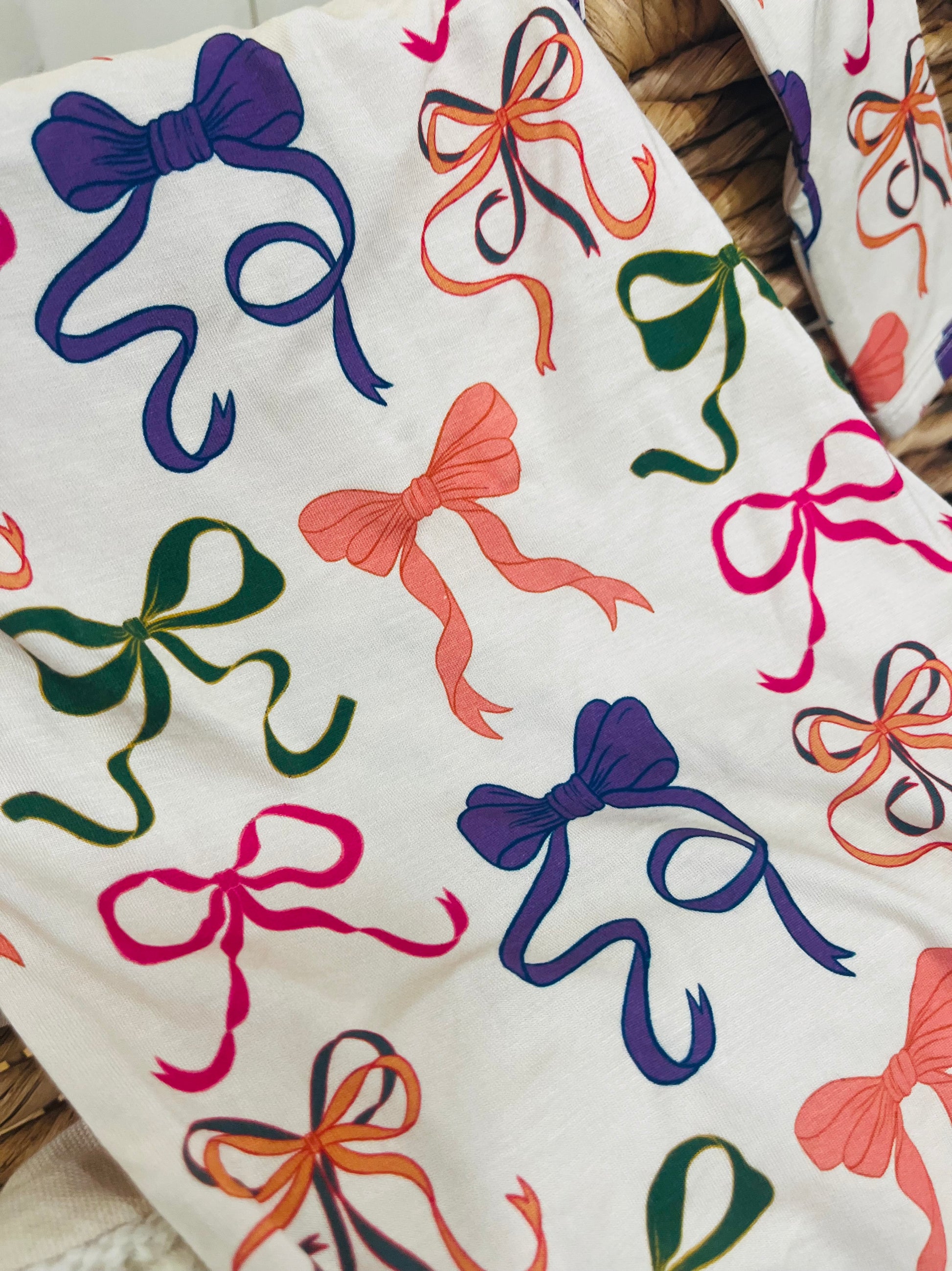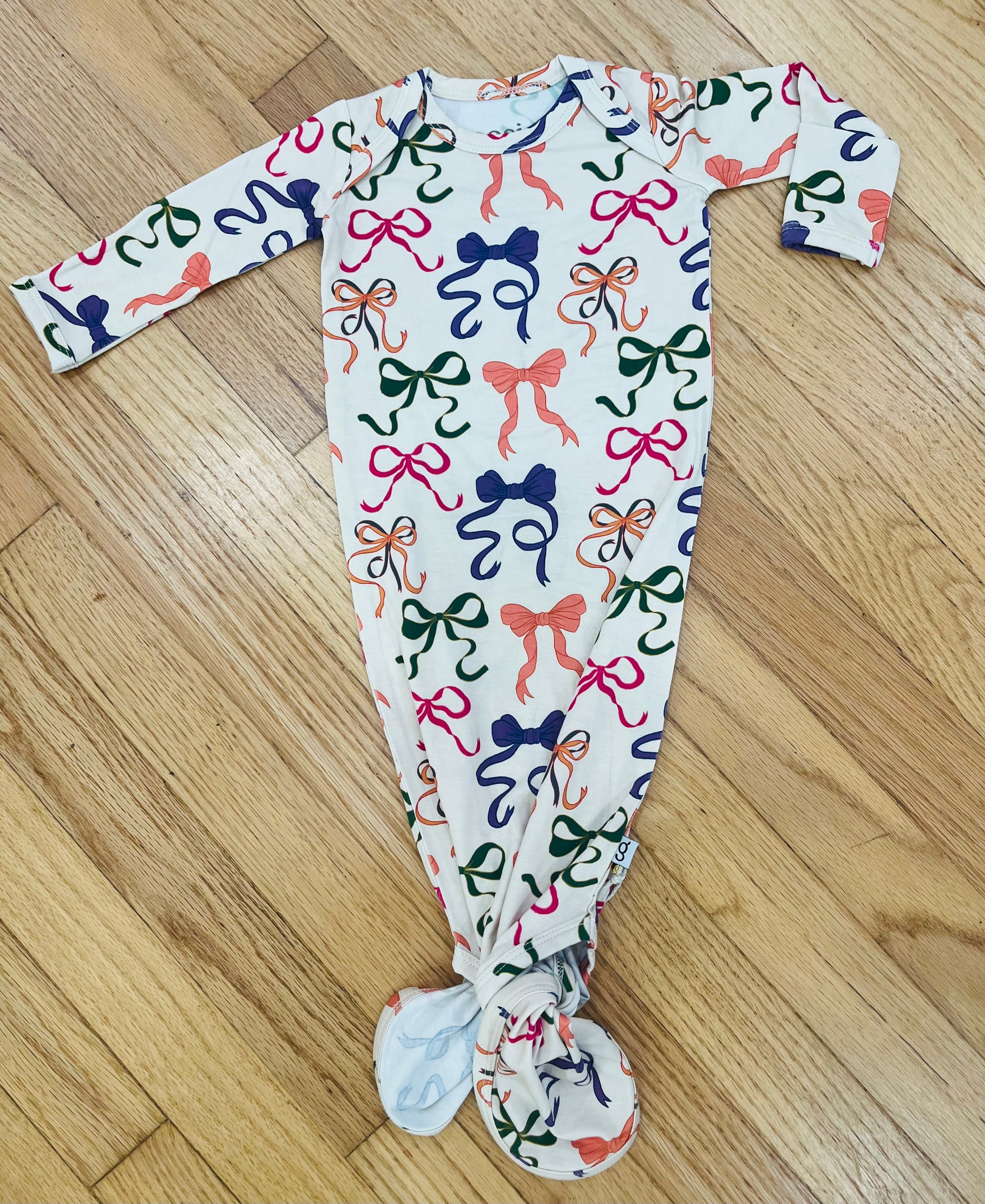 Knotted infant gown with foldable scratch mitts in 0-3 months.