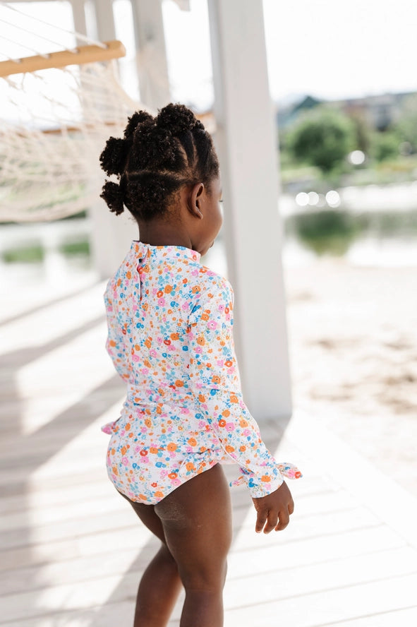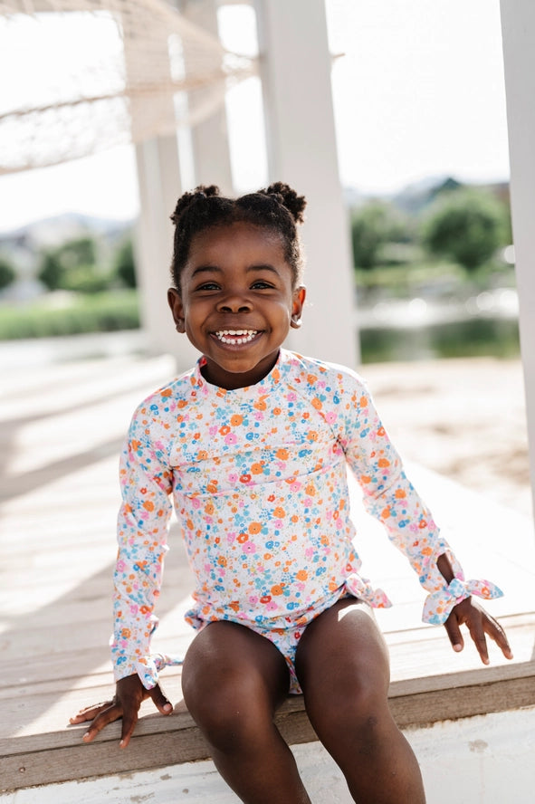 The Mia Swimsuit is a long sleeve rash guard with keyholes on the hand opening with a bow detail. Matching bows adorn the detached bottoms.