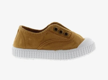 These sweet little kicks have a white toecap and soft elasticated inner section for comfort and no laces for easy slip on. Made of 100% organic cotton canvas with a natural vulcanized rubber sole.