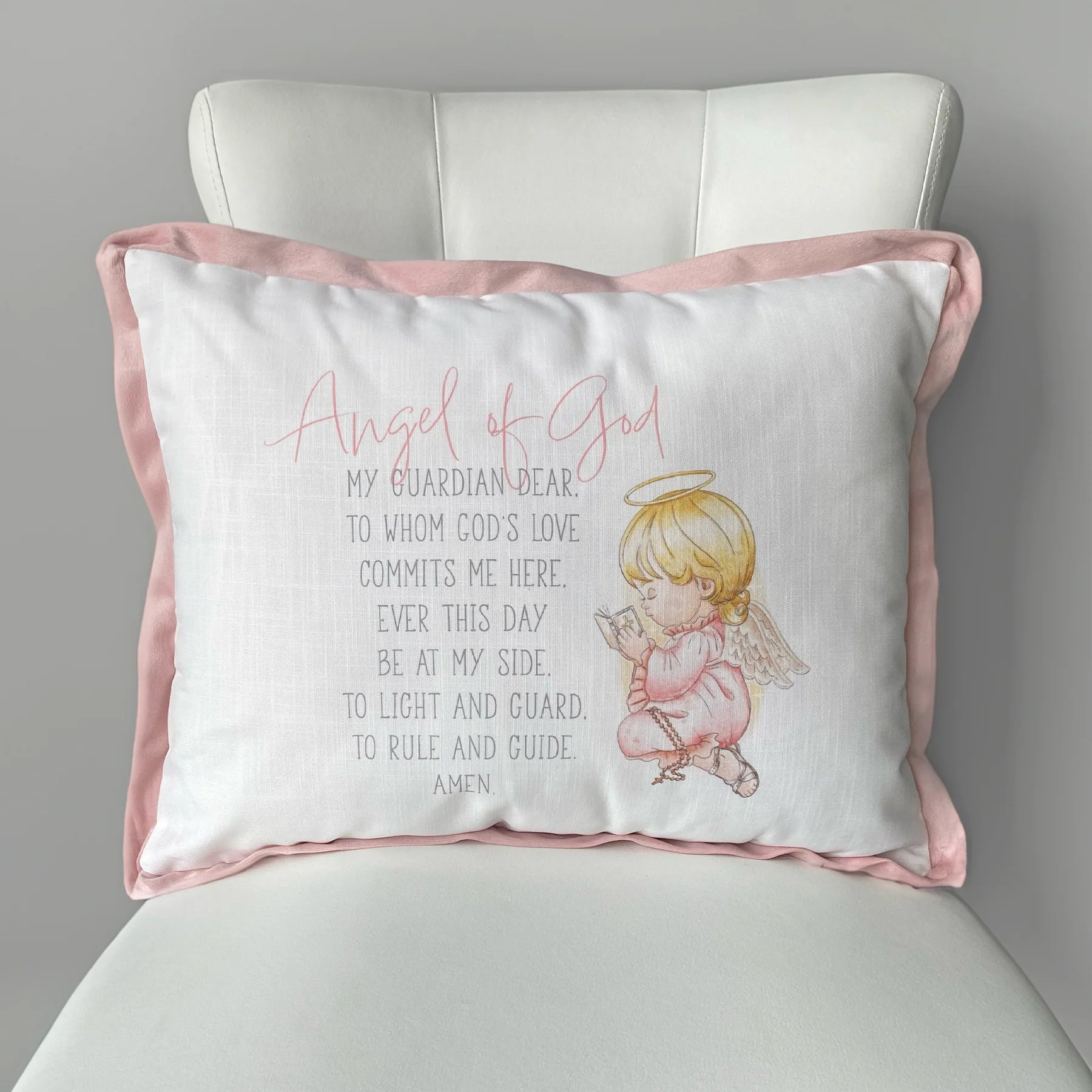 This pink Guardian Angel decorative throw pillows are the perfect way to celebrate baptisms, christenings, first communions, or any special event for your little one!